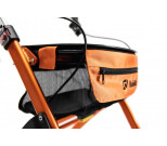 Rollaattorin perusvarusteluun kuuluvat lukittavat jarrut, tarjotin ja kori.