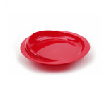 Lautanen jossa on korkea reunus yhdestä kohtaa. Lautasen saa kiinnitettyä pöytään imukupilla