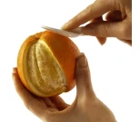 En praktisk apelsinskalare som hjälper att skära/dela skalet och skalar av det.